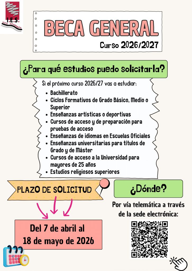 Se informa de que ya se encuentra abierto el plazo para solicitar la Beca General para el curso 2026/2027.