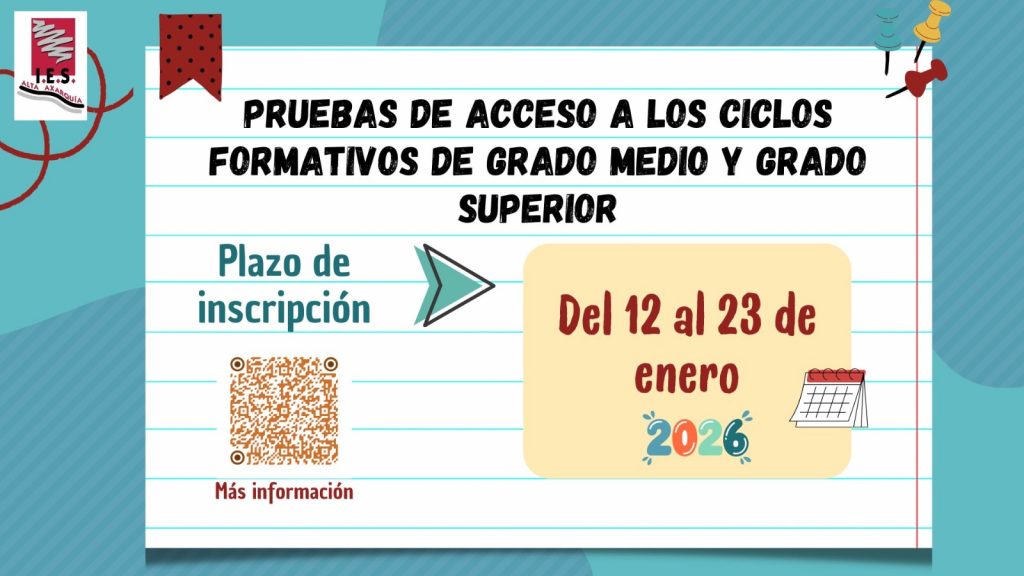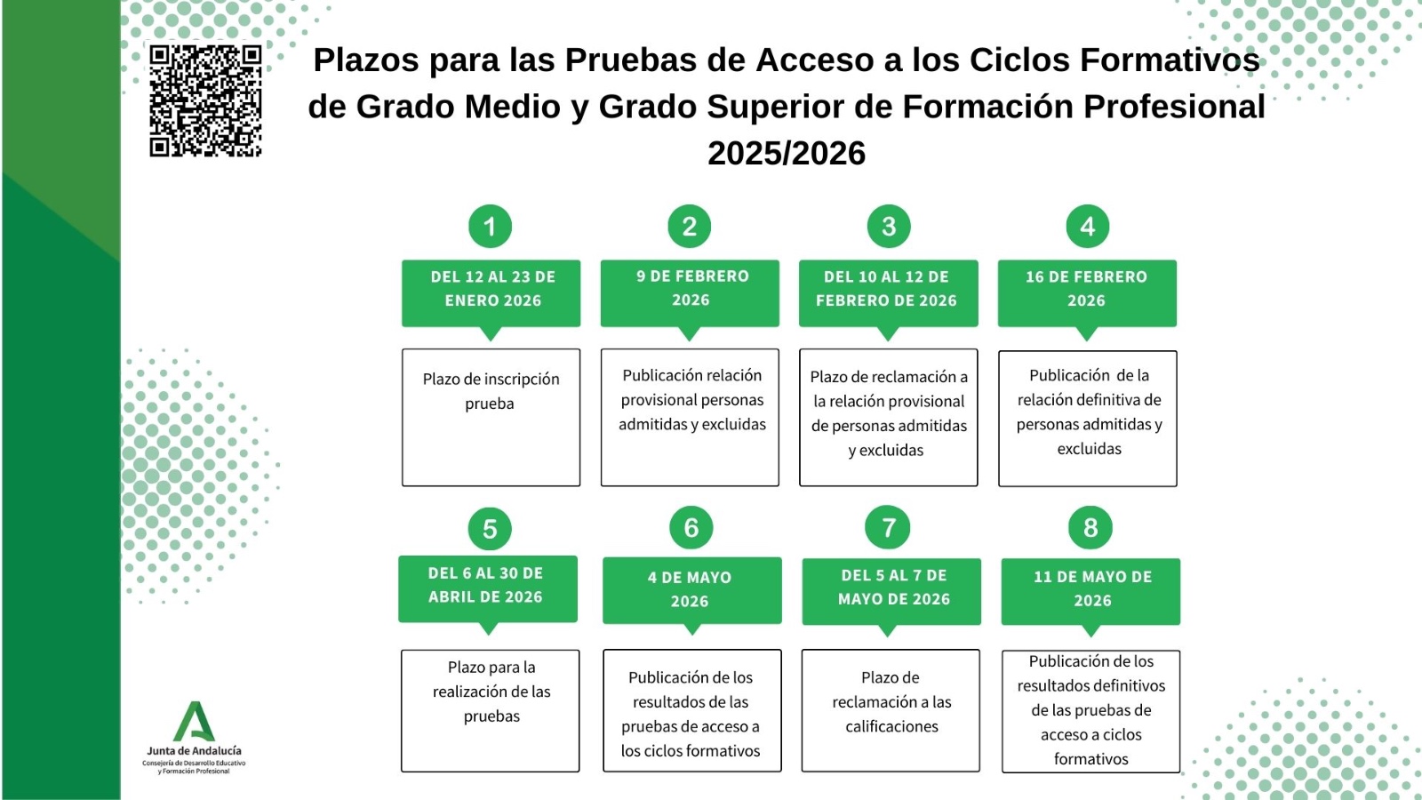 Consulta toda la información (requisitos, estructura de la prueba, fechas…) en el siguiente enlace: https://www.juntadeandalucia.es/educacion/portales/es/web/educacion-permanente/acceso-fp/pruebas-de-acceso-a-ciclos-formativos
